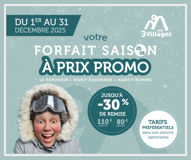 FORFAIT SAISON À PRIX PROMO ! C’est parti pour la saison d’hiver 2025/2026. Dès le 1er décembre, profitez de 30% de réduction sur le forfait saison des 3 Villages (Reposoir/Romme/Mont-Saxonnex) ! ✅ L’achat de forfaits saison Adulte vous permet de recevoir également une carte de 3 coupons Domaines Skiables de France (DSF) offrant des…